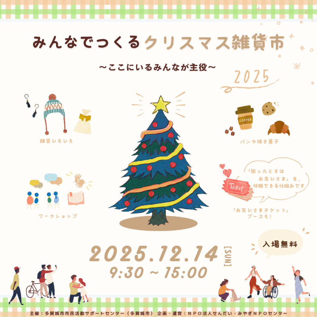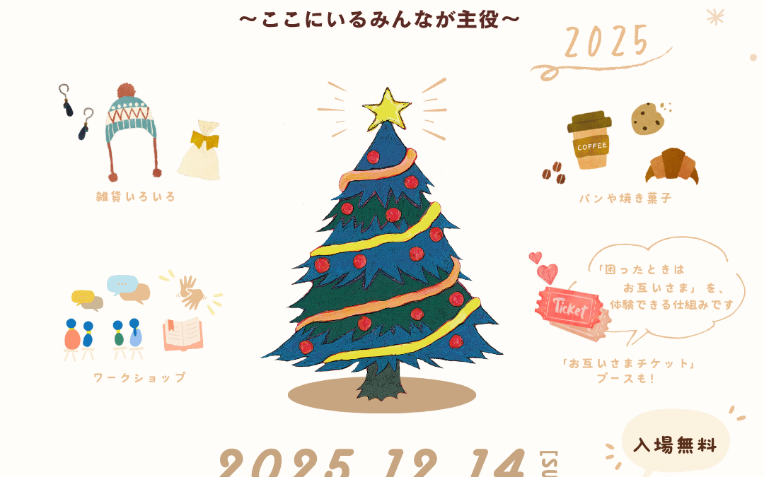 今年は「たがさぽのクリスマス雑貨市」から「みんなでつくるクリスマス雑貨市」と名前を変えて、出店者も来場者も、今まで以上にみんなが主体的に関わることができる雑貨市を目指します。