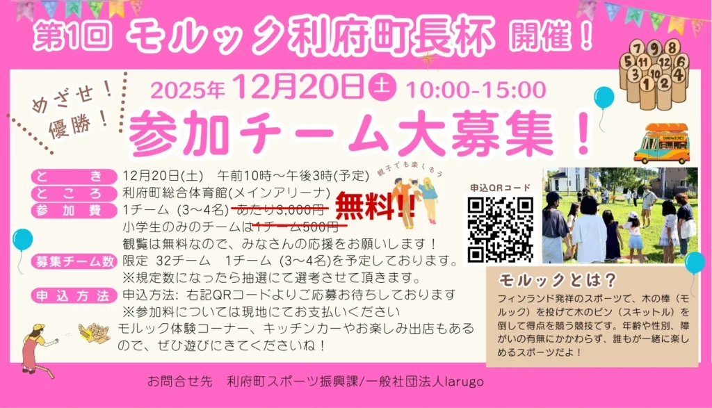 ※モルック大会は1チーム3000円(小学生以下のチームは500円)としておりましたが、利府町初のモルック大会の為、利府町役場スポーツ振興課さんにご協力頂き、今回は特別に参加費はなんと!